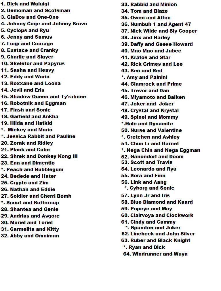 Any matchups looking good to anyone in this opening round? CHAOS vs Conquest sounds fun to me. I also want to see how Popeye does against Luigi and Courage.
